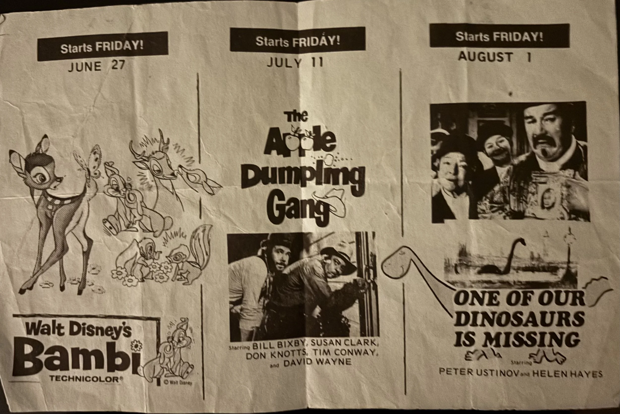Advertising for the 1975 re-release of Bambi (1942), The Apple Dumpling Gang, and One of Our Dinosaurs is Missing.